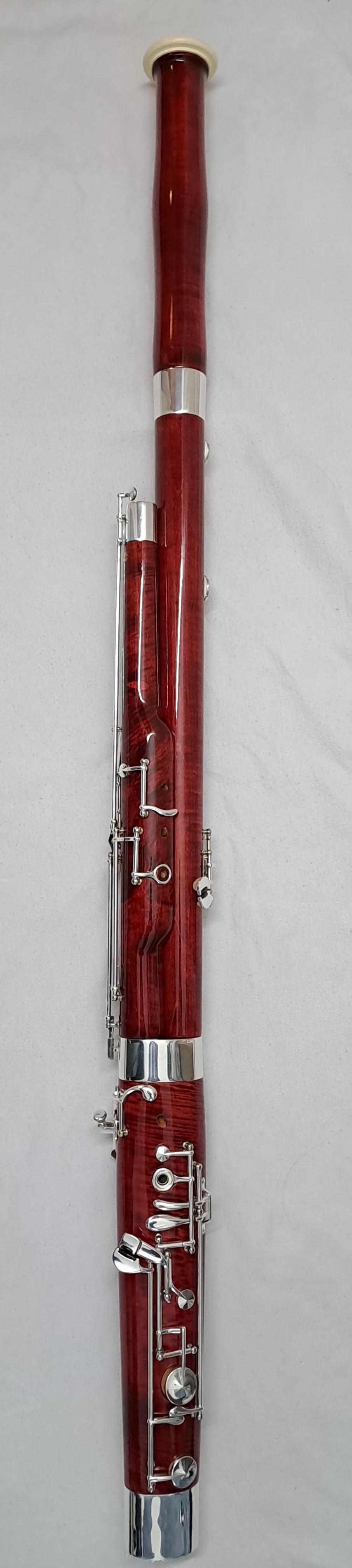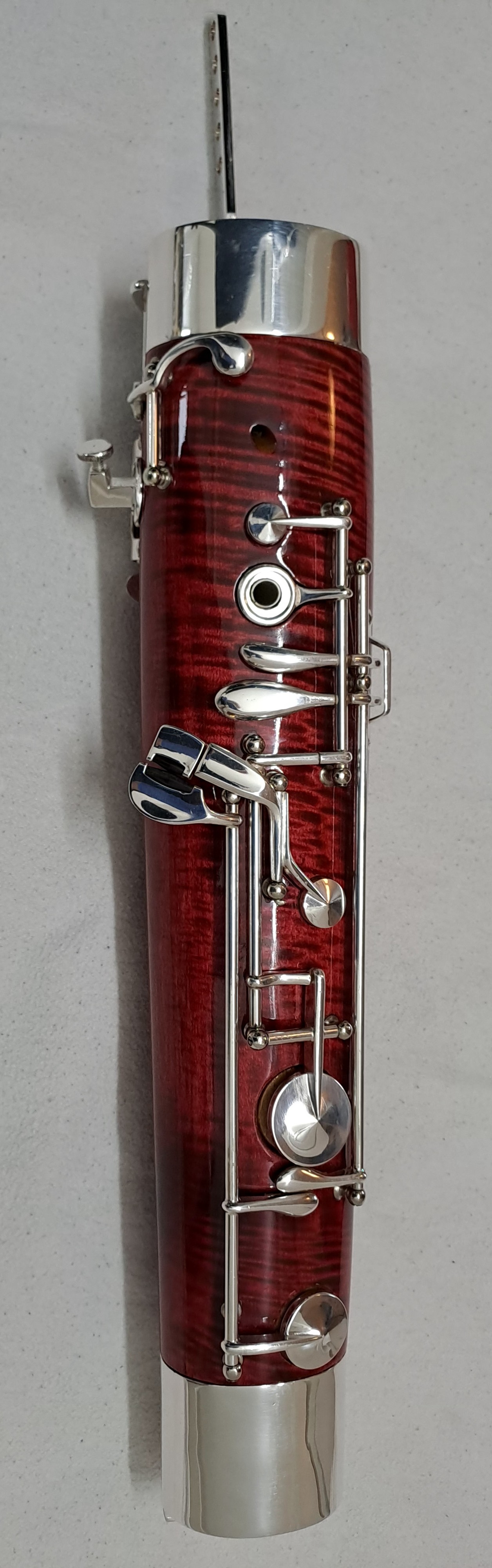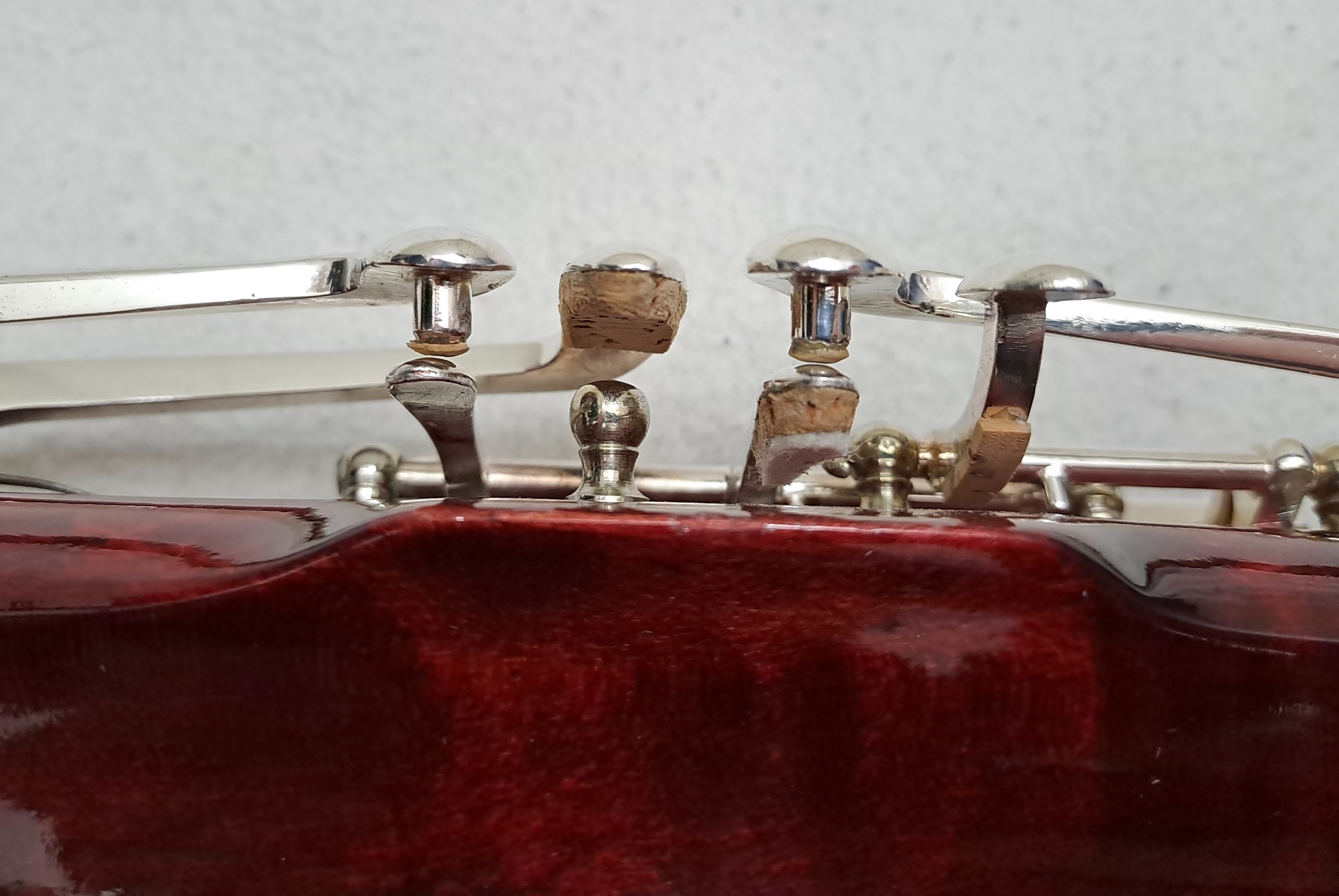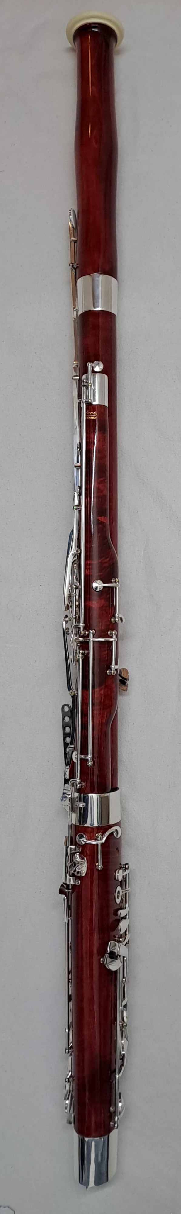 Folgendes Zubehör kann auf Wunsch kostenfrei beigelegt werden: Ein kleinerer Balancehalter sowie Ersatzteile für den Flügel-Bassstangen-Riegel. Zwei unbespielte Doppelblattrohre im Holzetui (Stärke F2, erstanden 2025). Stiefel und Flügel Putztuch, Schulter-Tragegurt von BG France, Korkfett von La Tromba sowie 2 Daumenstützen. Auf Anfrage sende ich gerne weitere Detailfotos des Instruments sowie der Originalrechnung.