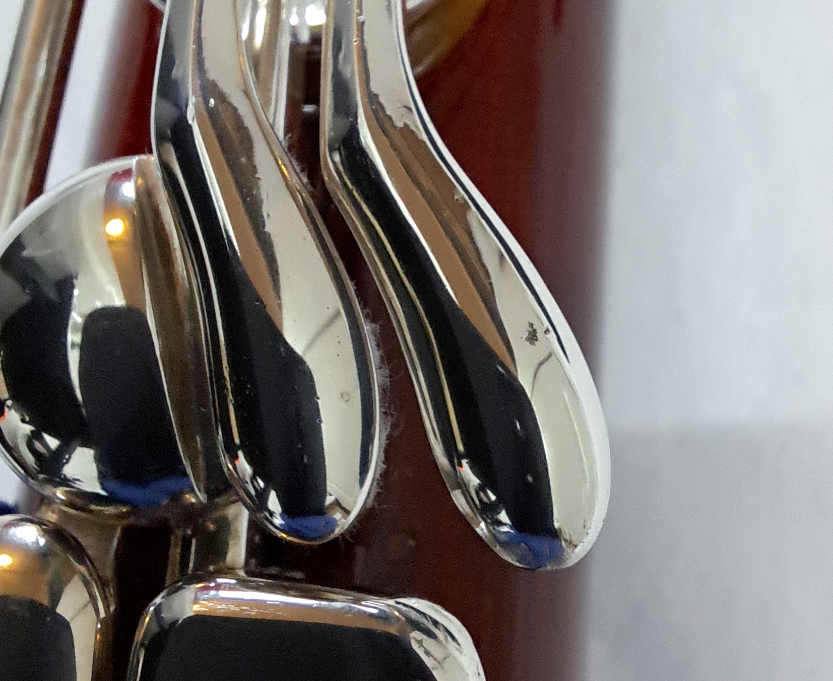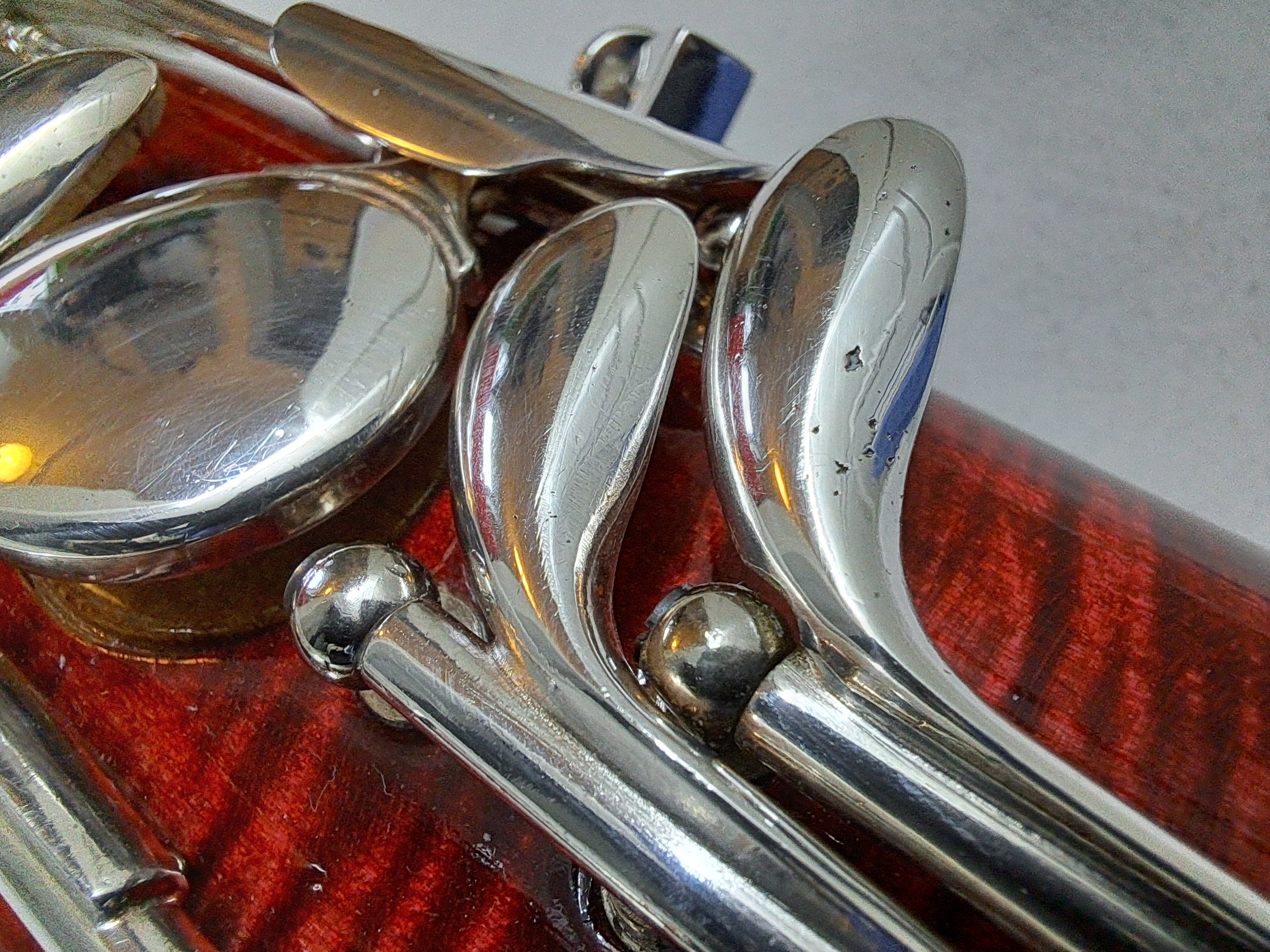 Die Versilberung weist an einigen Stellen kleine kosmetische Mängel auf (< 1% der Gesamtfläche). Diese haben keine Auswirkungen auf die Dichte oder Funktionsfähigkeit der Mechanik und sind bis auf wenige Ausnahmen (siehe Detailfotos) auch nicht tastbar. Kork und Filz an der Mechanik sind in sehr gutem Zustand.