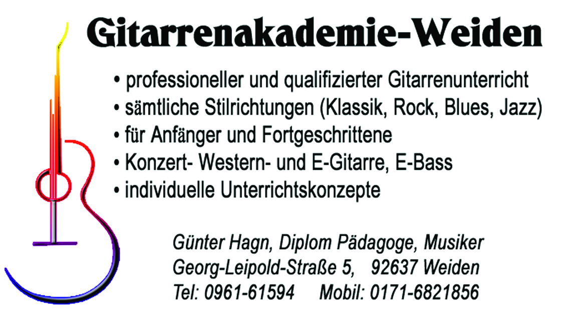 Professioneller und qualifizierter Gitarrenunterricht, sämtliche Stilrichtungen (Klassik, Rock, Blues, Jazz), für Anfänger und Fortgeschrittene, alle Altersgruppen, Konzert-Western- und E-Gitarre, E-Bass, Ukulele. Individuelle Unterrichtskonzepte. Neben festen Verträgen mit wöchentlichem Unterricht biete ich auch Einzelstunden und 10er Karten für flexible Unterrichtszeiten an. Günter Hagn, Diplom-Pädagoge/ Musiker.