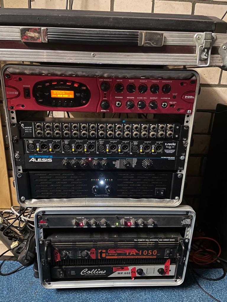 – komplett ausgestattet mit unkomplizierter Gesangsanlage/PA, Drumset, Bassverstärker, 2 Gitarrenverstärkern, Mikrofone und Stative, Abhöre (CD/Aux) mit 2 Lautsprechersystemen