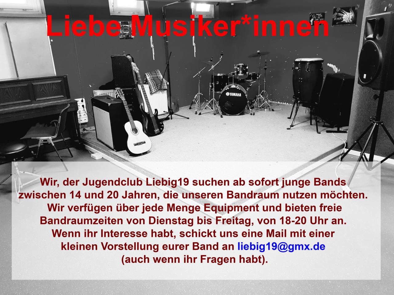 Hallo, wir sind ein Jugendclub in Berlin Friedrichshain und suchen junge Bands die bei uns proben möchten. Wir sind bestens ausgerüstet mit Schlagzeug, Bass- & E-Gitarre, Congas, Verstärkern, Monitoren, Mics uvm. Der Proberaum selbst hat in etwa eine Größe von 30qm und bietet dazu noch einen Raum in welchem ihr eure Instrumente abstellen könnt. Wir wollen eigentlich auch kein Geld von euch, vielleicht einen symbolischen Monatsbeitrag. Die einzige Voraussetzung: Ihr solltet alterstechnisch irgendwie zwischen 14 und 21 Jahren sein. Habt ihr noch Fragen? Dann meldet euch gern per Mail oder Telefon bei uns. VG Jugendclub Liebig19