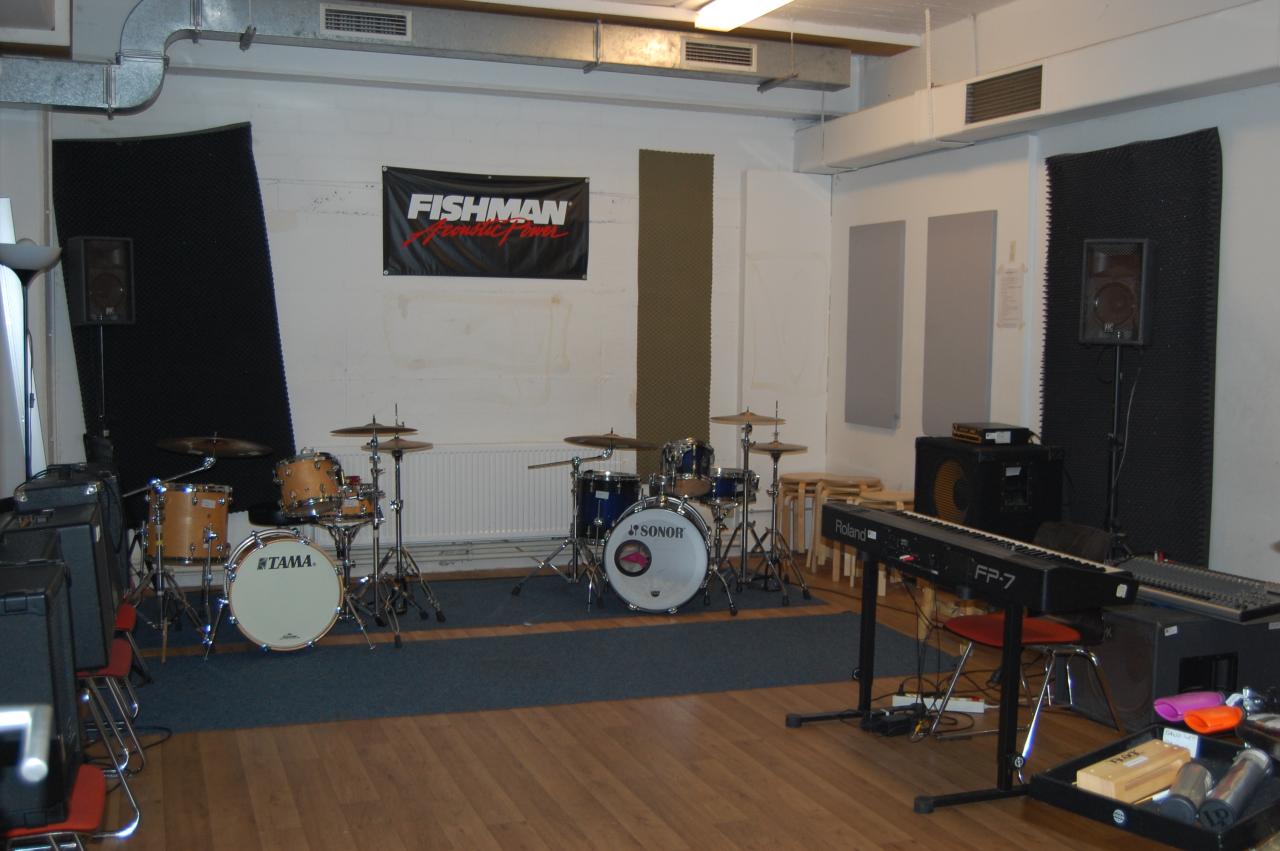 Einrichtung: Gitarren-Amp x2, Bass-Amp x2, Digitalpiano: Roland FP-7, Drumset x2, PA, Stühle, Mikrofon- und Notenständer