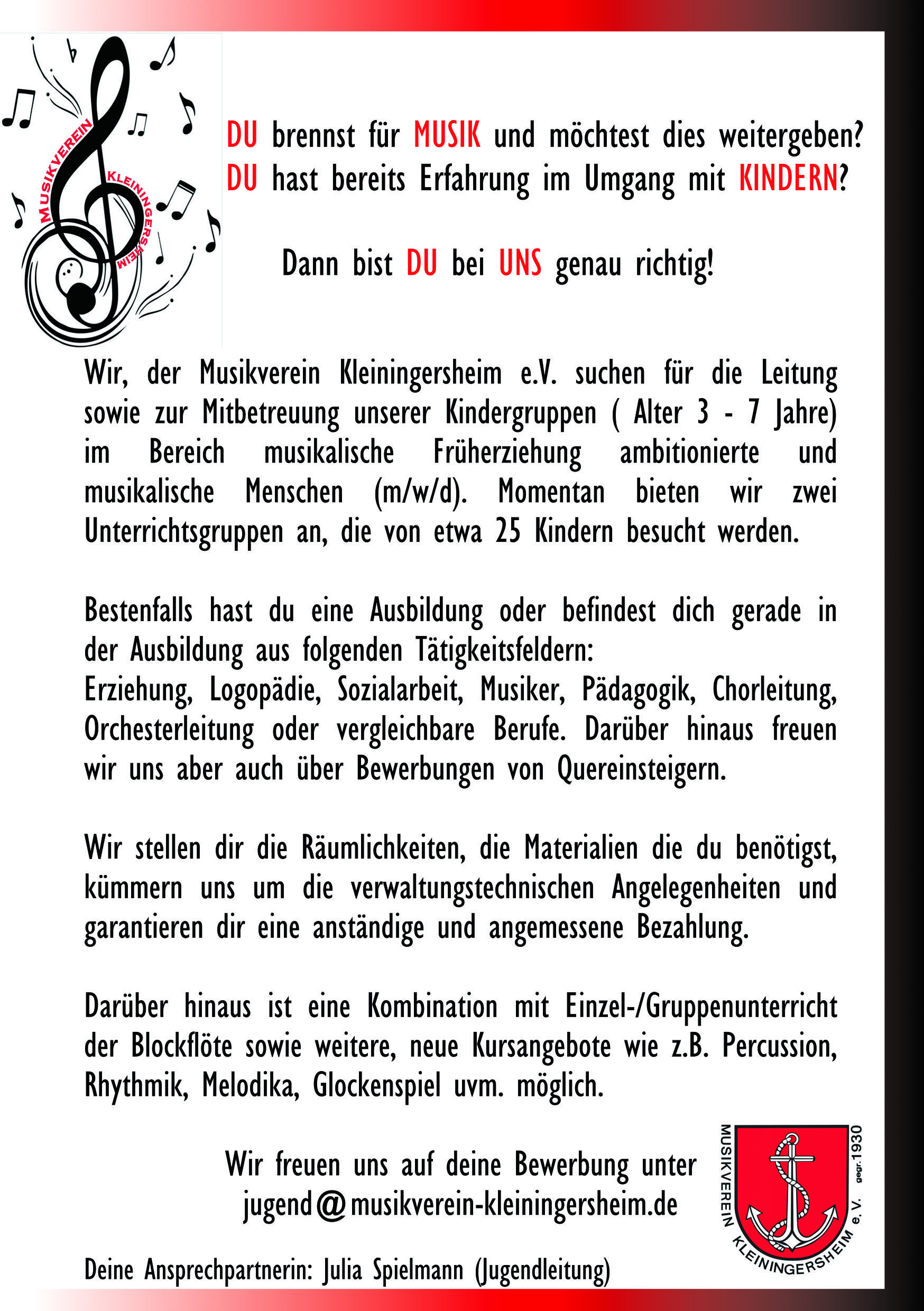 Wir, der Musikverein Kleiningersheim e.V. suchen für die Leitung unserer Kindergruppen (Alter 3 bis 7 Jahre) im Bereich musikalische Früherziehung ambitionierte und musikalische Menschen (m/w/d). Momentan bieten wir zwei Unterrichtsgruppen an, die von etwa 25 Kindern besucht werden.