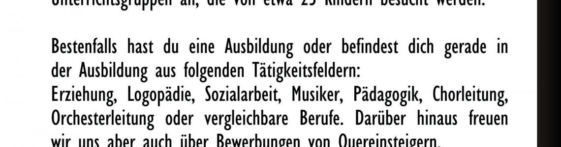 Erziehung, Logopädie, Sozialarbeit, Musiker, Pädagogik, Chorleitung, Orchesterleitung oder vergleichbare Berufe. Darüber hinaus freuen wir uns aber auch über Bewerbungen von Quereinsteigern.